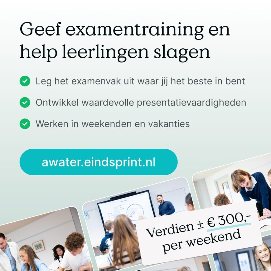 Eindsprint zoekt voor de examenvoorbereiding 2026 nieuwe studenten die examentraining komen geven. Help jij leerlingen voorbereiden op de spannendste toetsen uit hun leven? Jij kan hun held zijn door je in te schrijven via awater.eindsprint.nl