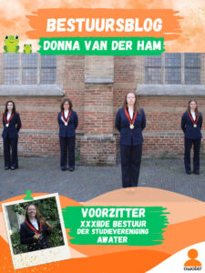 Eens in de zoveel tijd blikt een bestuurslid terug op wat we allemaal hebben beleefd. Deze keer is het de eer aan de voorzitter van het XXXIIste bestuur: Donna van der Ham. Om te beginnen moet ik even opbiechten dat ik mijn eerste studiejaar zonder Awater heb gedaan. Pas aan het eind van het jaar